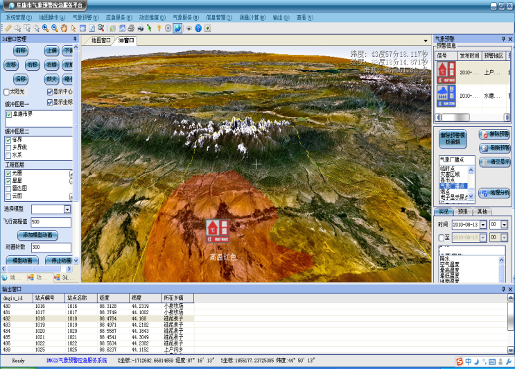 3)海洋气象预警服务首先在手动绘制所得到的气象预警区域内,可以对预警区域内的港口、渔场、航洋航线、经济设施等信息进行地理图层的分析,并实时展示于地图界面,完成二三维地图的自动切换。其次基于气象预警分析服务文档模板,完成预警文档制作,进而再集成结合多种发布手段,对气象预警信号或服务文档产品进行高效快速的发布,可将预警信号精确定向发布于预警区域内的数据终端上。